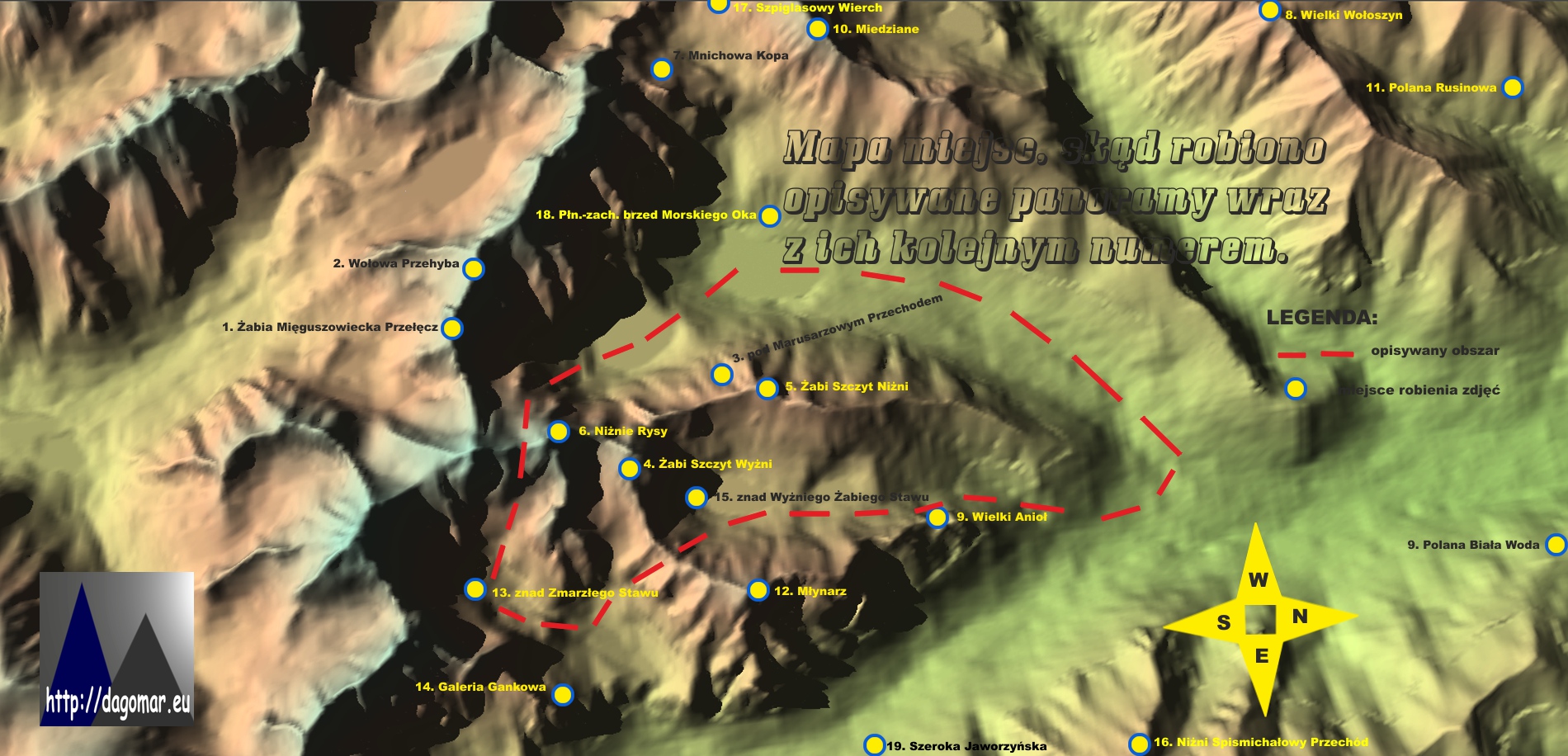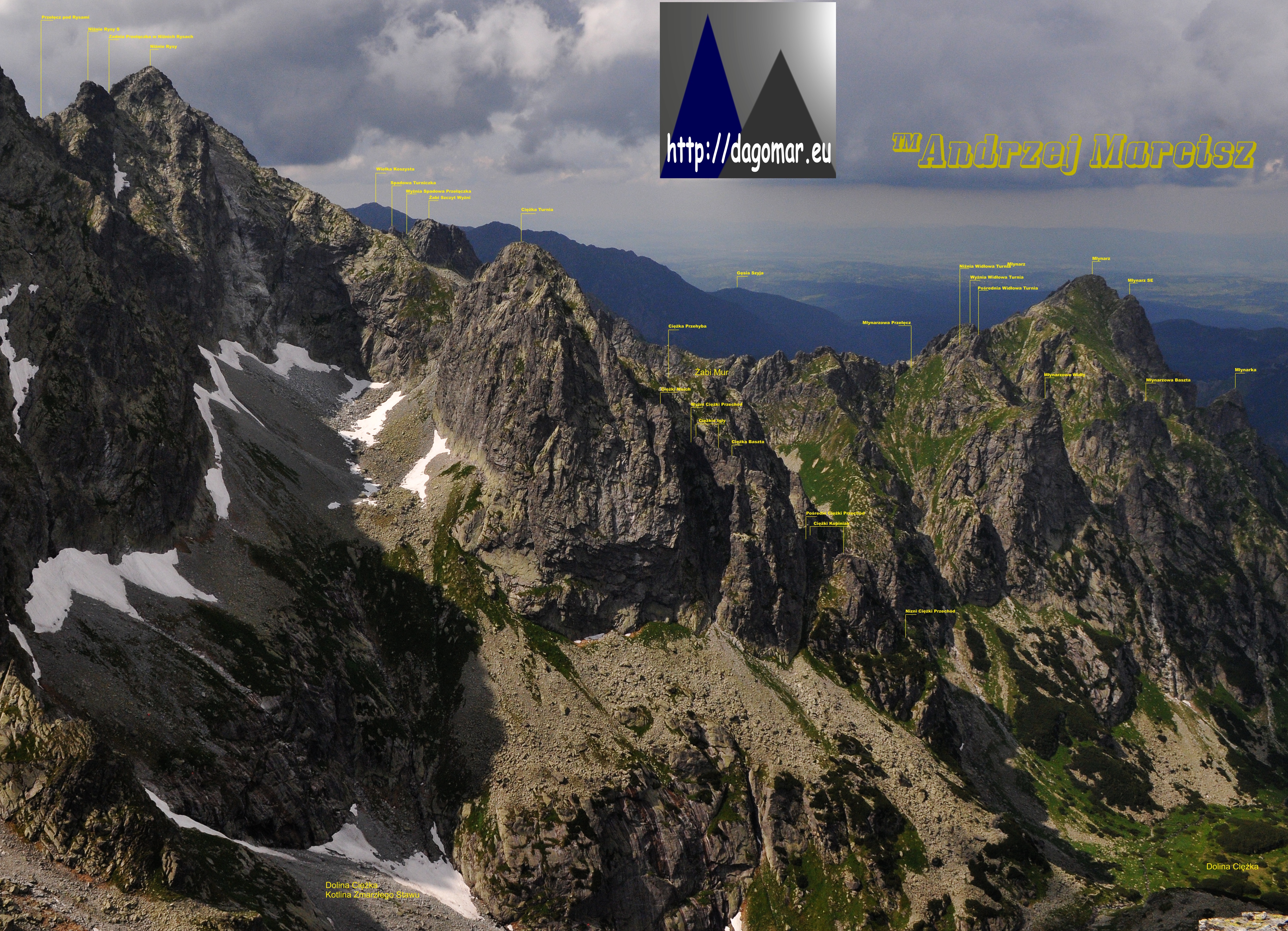 Grań Żabiego z jednej strony jest znakomicie widoczna od strony ruchliwego szlaku prowadzącego do Morskiego Oka, a z drugiej ukryta przed przeciętnym turystą granią Młynarza i tajemniczą Doliną Białczańską. Szlakowo nie jest też dostępna Dolina Ciężka, tak więc Ciężka Turnia, oraz leżący już w grani Młynarza Żabi Szczyt Wyżni nie są dla turystów dostępne widokowo z żadnej strony. W niniejszym rozdziale Przewodnika starałem się niedogodności te usunąć i ukazać omawiane masywy w dużym zbliżeniu ze wszystkich stron.