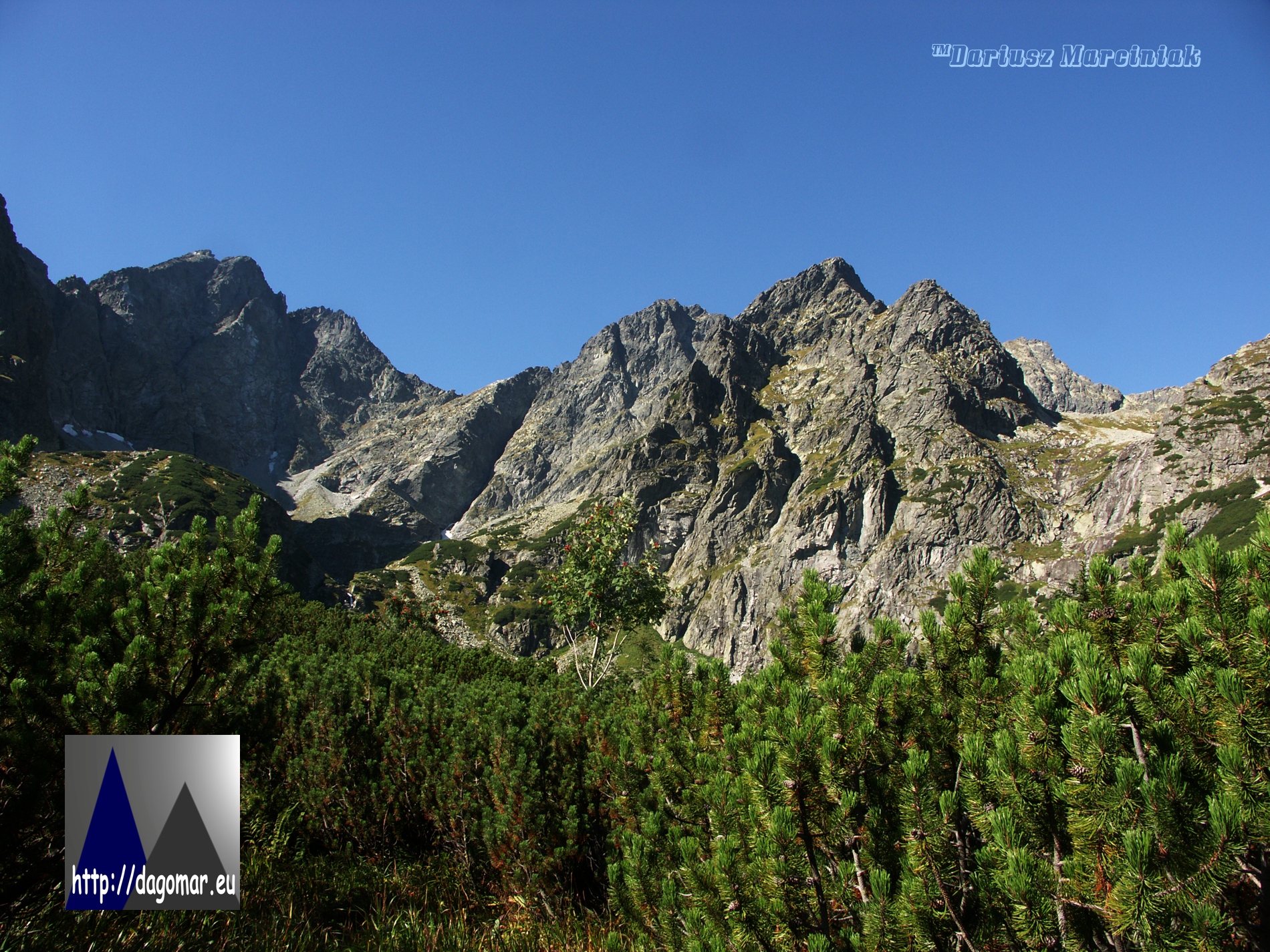 Granie Apostołów i Żabiego Mnicha zdjęte z Kępy. Nad nimi górują Żabi Szczyt Wyżni, Spadowa Turniczka i Niżnie Rysy.