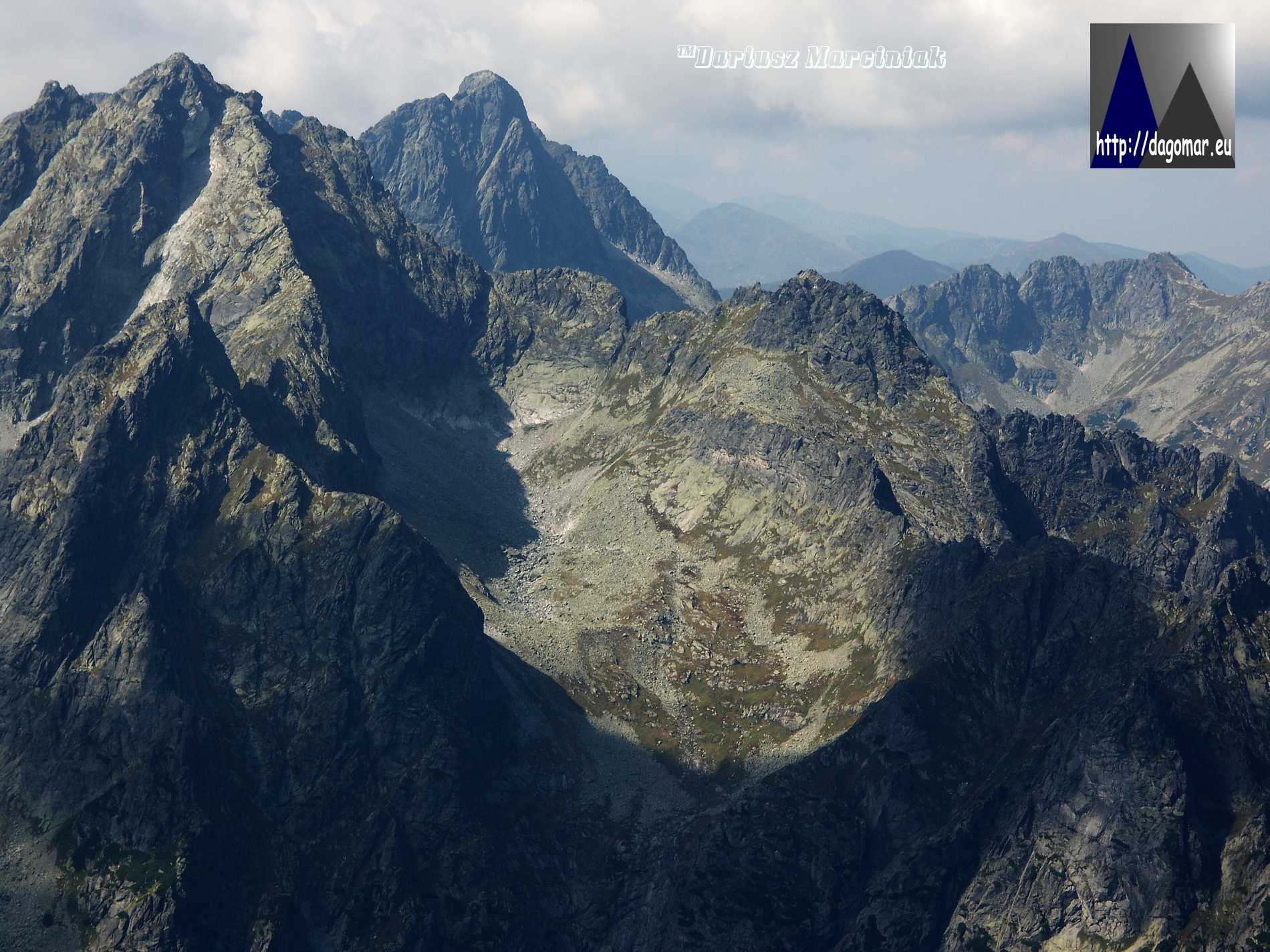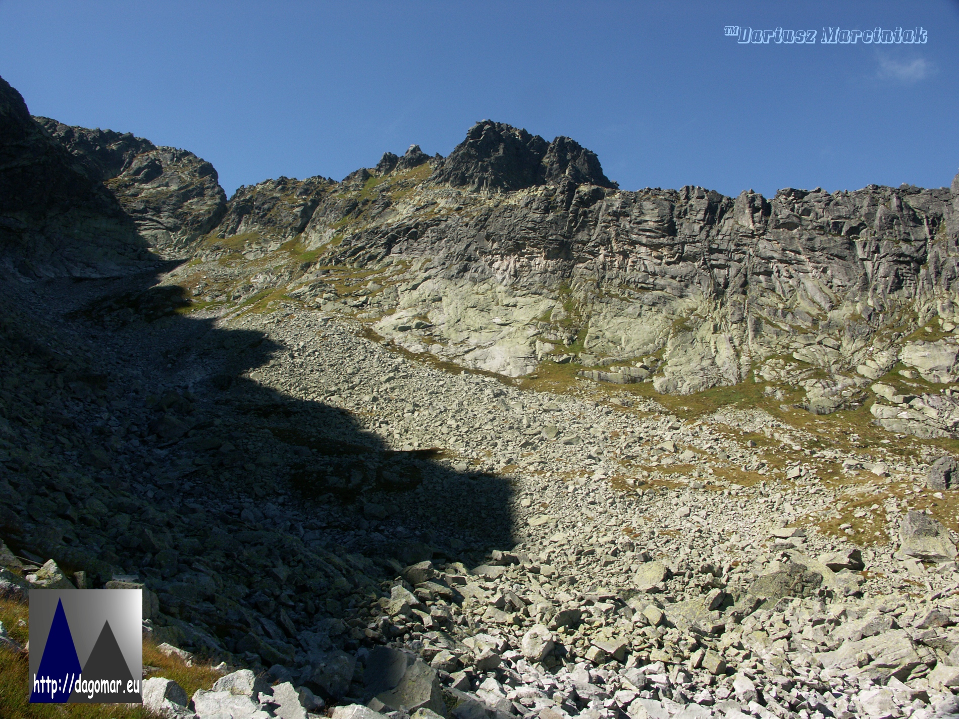 Panoramka z turniczki nad Marusarzową Przełączką. Z lewej strony zdjęcia Marusarzowa Turnia, z prawej Grań Apostołów i Żabi Szczyt Niżni. W dole Marusarzowy Żleb.